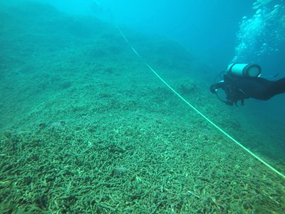 | In Dominica, a large area of fragile branching corals was flattened by hurricane waves |