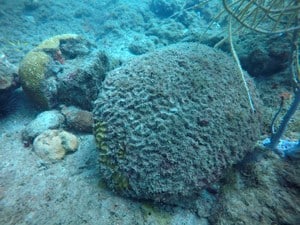 | This brain coral was broken and rolled by the hurricane, now mostly dead, but a small tan piece is still alive and will likely recover. |