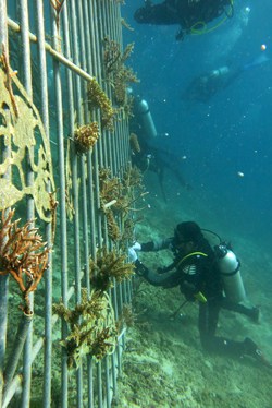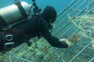 Expedition participants fixed fragments of damaged corals, previously collected from degraded areas of the reef, to the mail of this pyramid-shaped construction. The objective is to facilitate the regrowth and transformation over time into a real natural reef, a worthy conclusion of global involvement proceeding from knowledge through recovery of a species more and more vulnerable to extinction.