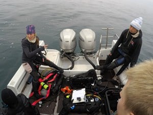 The instruments that measure pH are custom built at MBARI and have to withstand California’s harsh ocean conditions year round. Installing them is not an easy task. In order to measure the changes directly in the kelp forest, we have to attach the sensors to the rocky reef seafloor. To do this, we send teams of divers, equipped with underwater pneumatic drills and lots of stainless steel hardware, out to the reef. While one diver drills holes into the rock, others swim back and forth to supply the scuba tanks needed to operate the air powered drill. Then, everyone screws stainless steel bolts into the rock to which the instrument is attached. Once all the bolts are tightened the sensor is calibrated and then ready to collect pH, oxygen and temperature data every 15 minutes. All of the information is stored in the instrument and downloaded when we return to the reef after a few months. The temperature probes can be installed during Reef Check surveys and record temperature every few minutes for over a year with high accuracy. They will be retrieved during our annual reef surveys. We have hired Kate Vylet to be our Climate Change Research Coordinator and to integrate this work with our citizen science monitoring. For 2018, we are looking forward to training our citizen scientists how to retrieve the data and service the sensors.