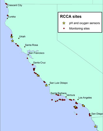 We have installed very accurate instruments measuring temperature, ocean pH and dissolved oxygen in kelp forests at Reef Check sites ranging from Mendocino County to southern California. We have installed pH and oxygen sensors in remote locations such as Point Arena (Mendocino County), the Big Sur Coast, Catalina Island and even in Ensenada, Mexico where little climate change research has been done. In addition, we have installed temperature sensors at most of our reef monitoring sites. Over the next few years, we expect to see water temperatures increase, water to become more acidic, and local low oxygen zones to become more common.